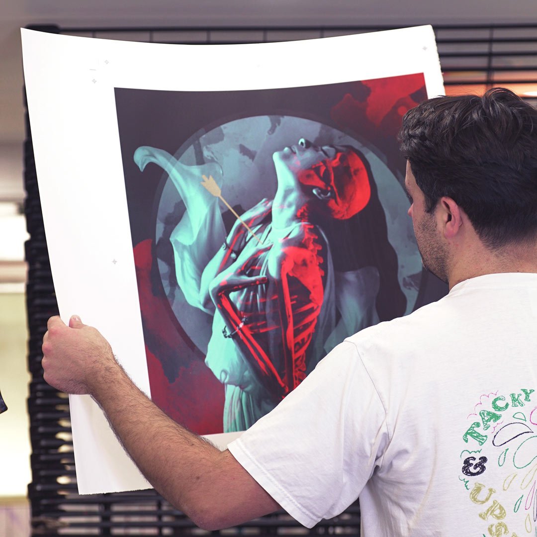 6-Color Screen Print with Gloss Varnish, Metallic Gold Ink on Hand-Deckled 300gsm Somerset Satin Paper.